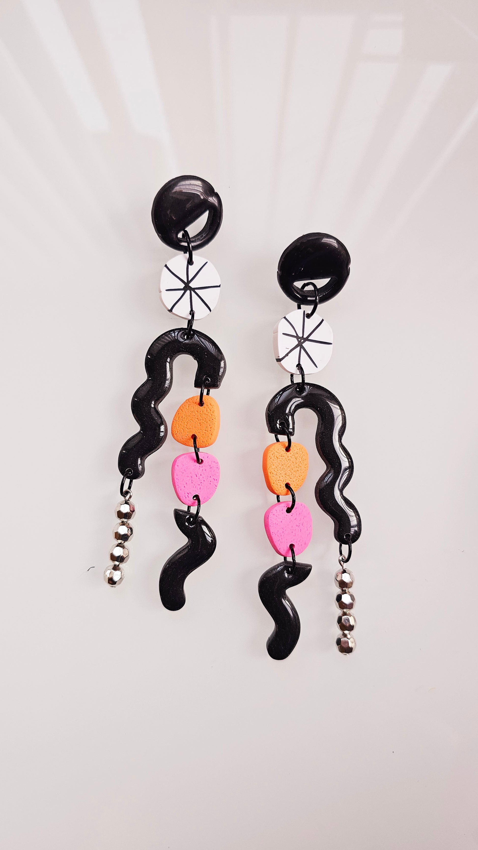 Make a bold statement with these eye-catching asymmetric earrings that blend playful colors with modern geometric design. Each earring features a unique arrangement of black glossy shapes, crisp white starburst accents, vibrant pink and orange circles, and elegant wavy elements finished with silver-tone beaded details.