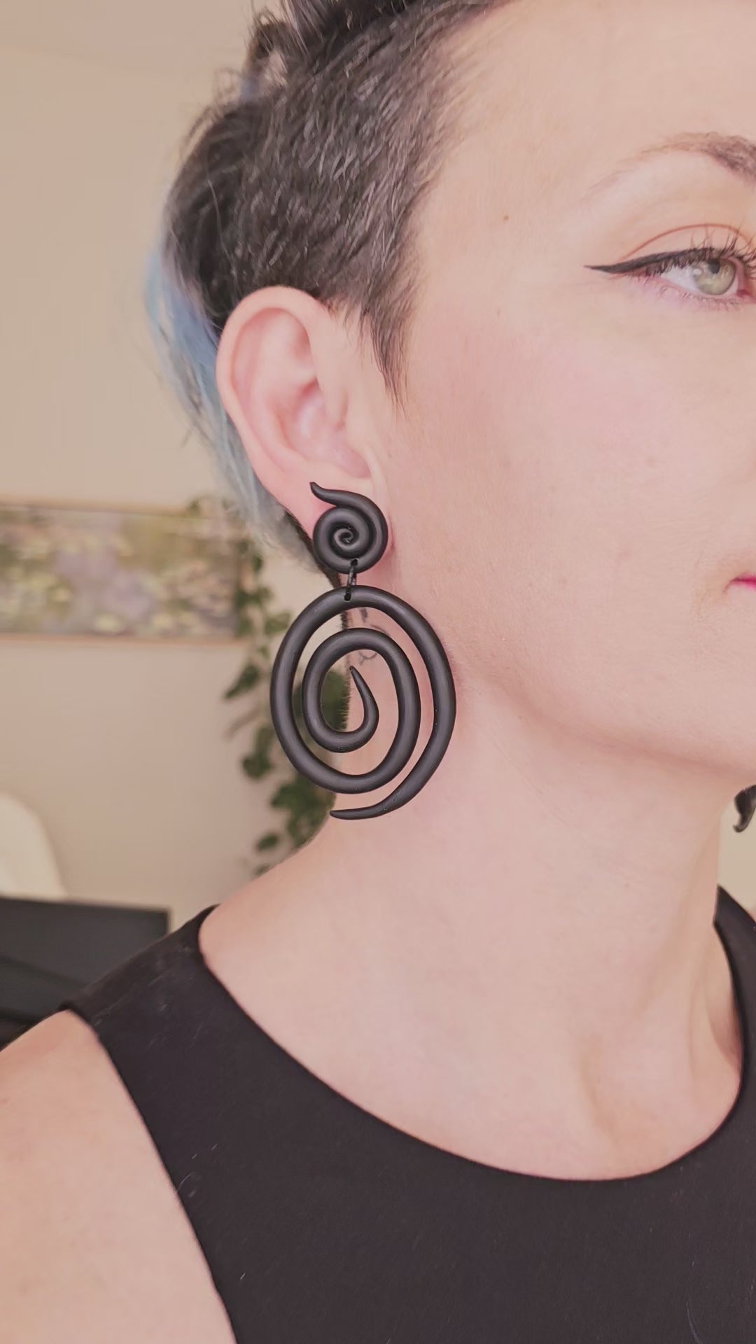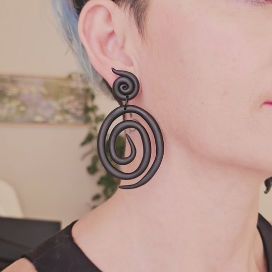 Black Spiral Polymer Clay Statement Earrings - Handmade Lightweight Dangle Earrings