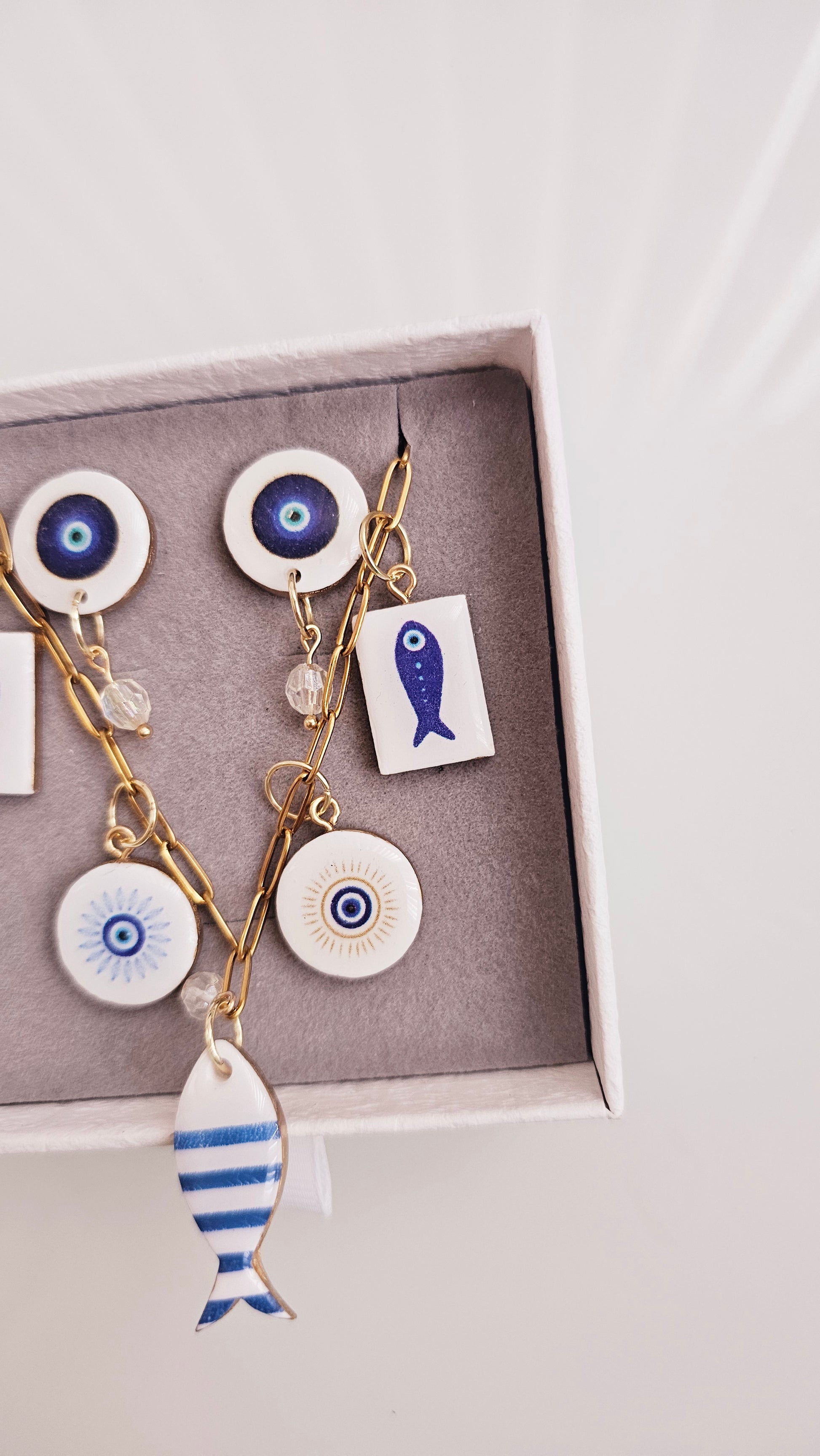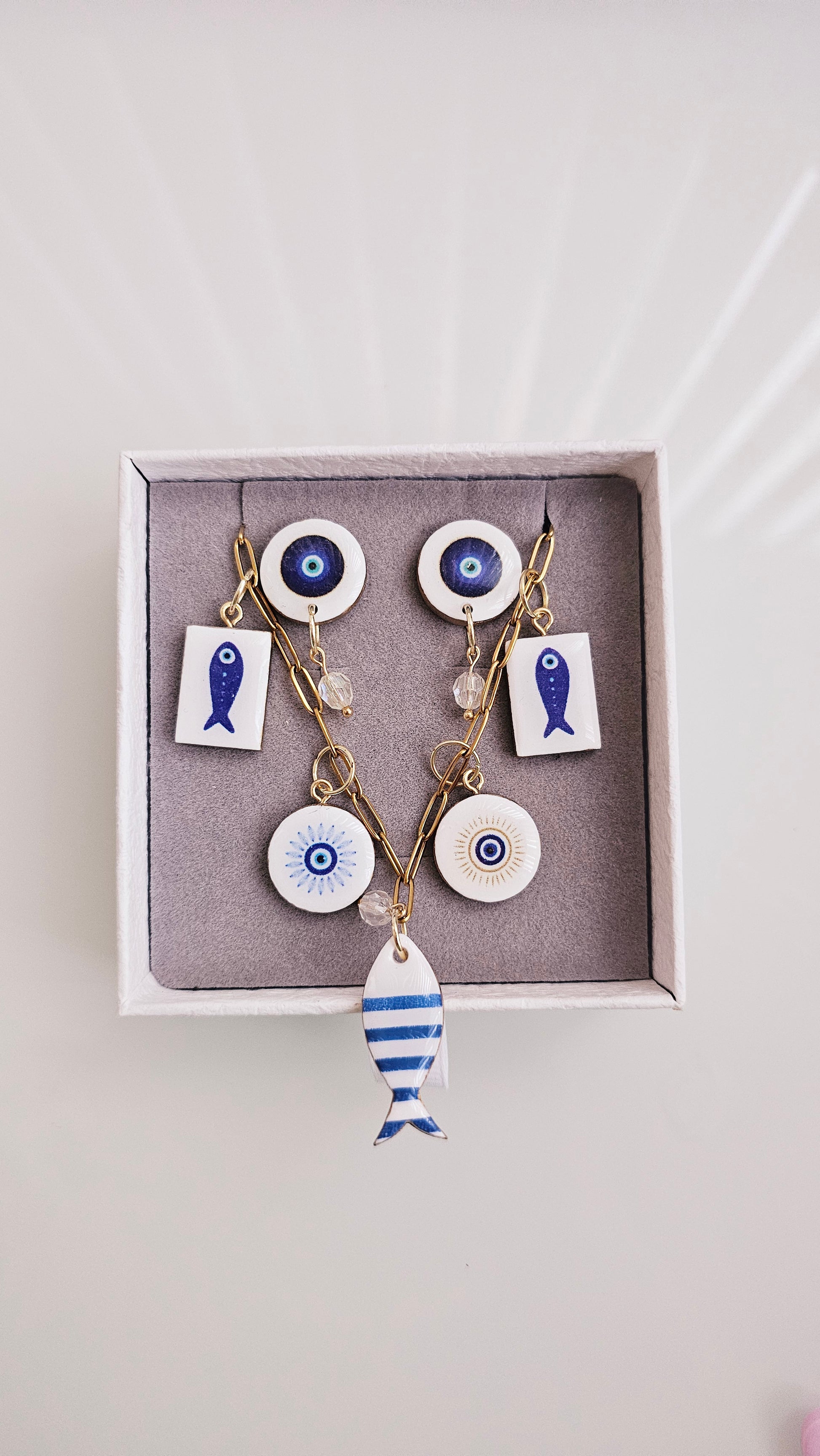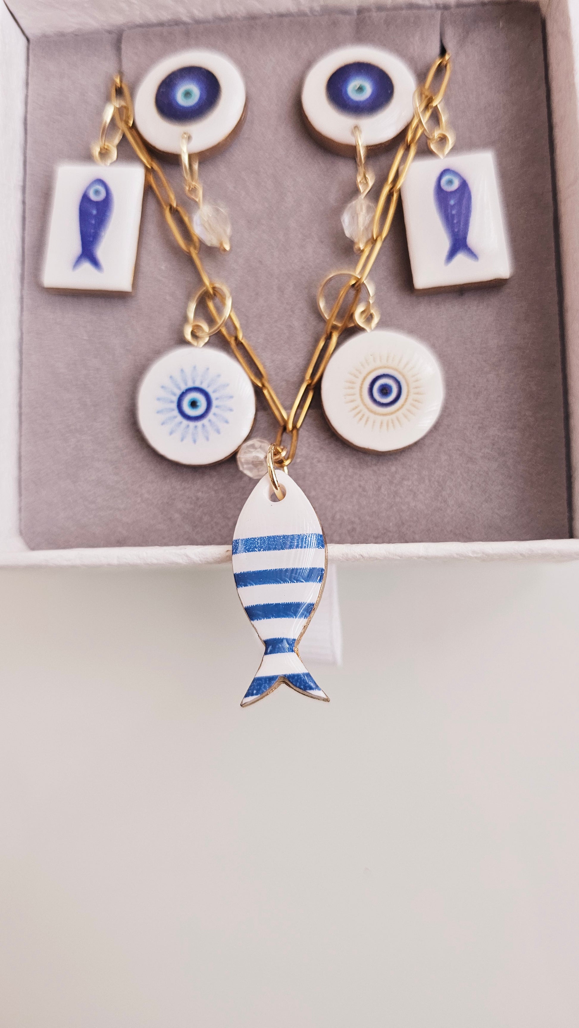 Bring a touch of coastal charm and good energy to your day with this handmade polymer clay jewelry set. The Blue Talisman Gift Box includes a matching necklace and earring pair, featuring hand-painted fish motifs and protective evil-eye designs.