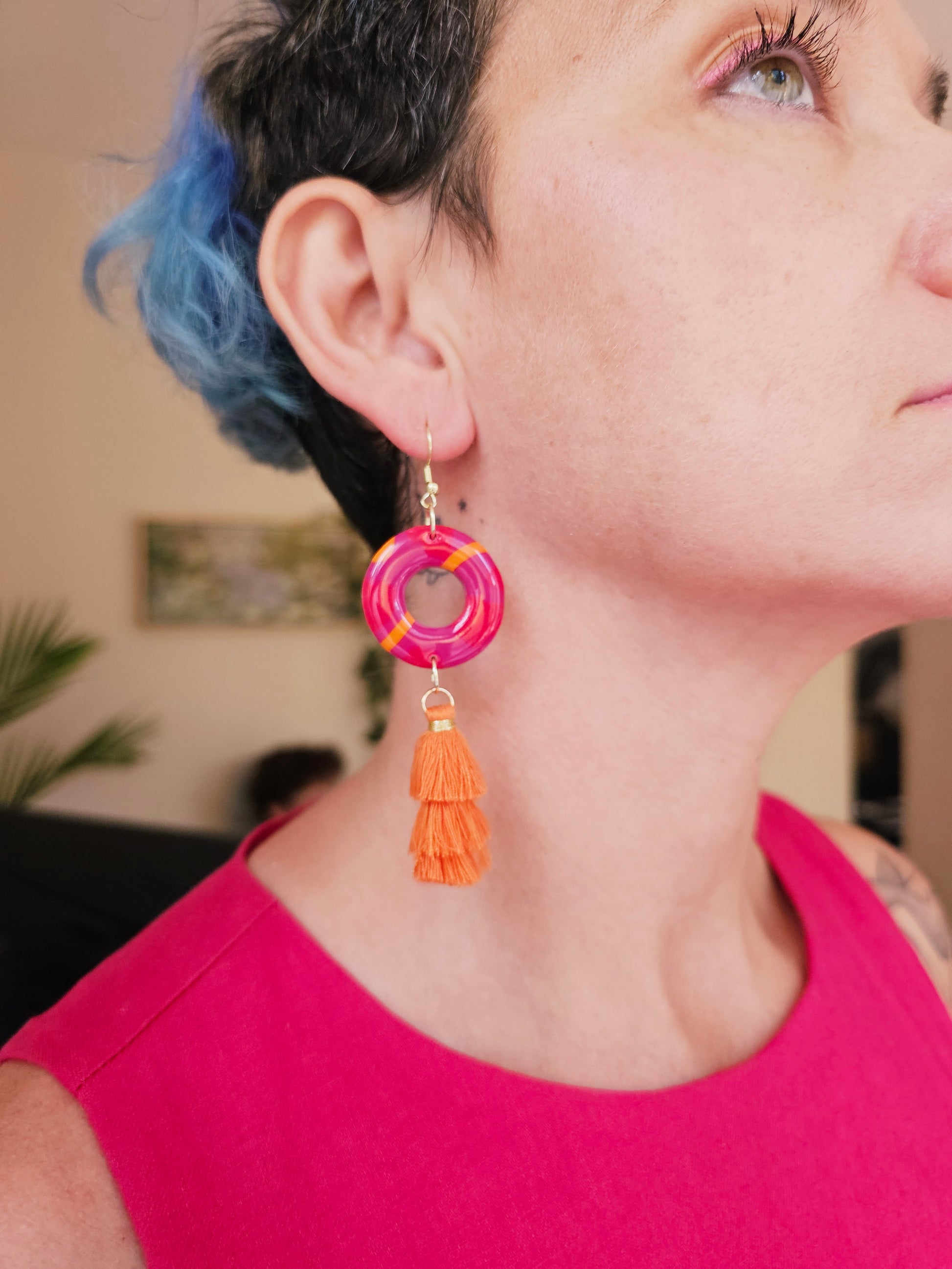 Get ready to turn heads with these absolutely stunning orange pink polymer clay earrings! These playful beauties feature bold geometric circles in vibrant fuchsia and coral tones, topped with luxurious tiered tassels that dance with every step.