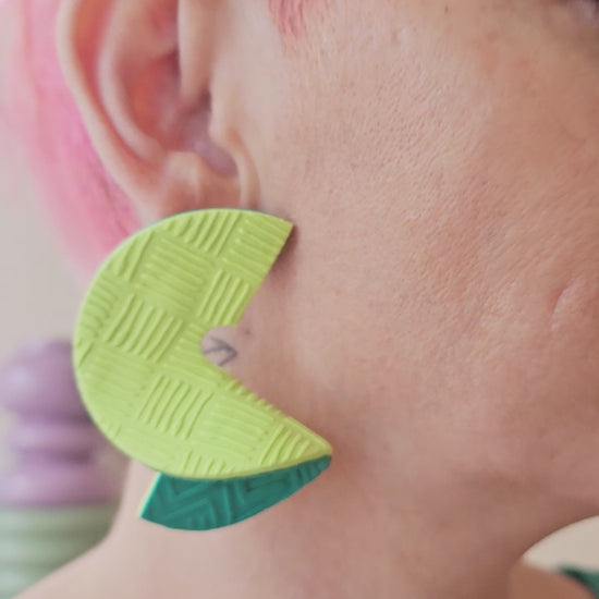 Turn heads with the Neon Fold Sculptural Studs, a pair of oversized statement earrings crafted in vibrant lime and deep teal polymer clay. Each earring features a bold folded form, creating a dimensional twist that pops beautifully against the skin. The embossed surface texture adds an extra layer of artistry, making these earrings feel like miniature contemporary sculptures.