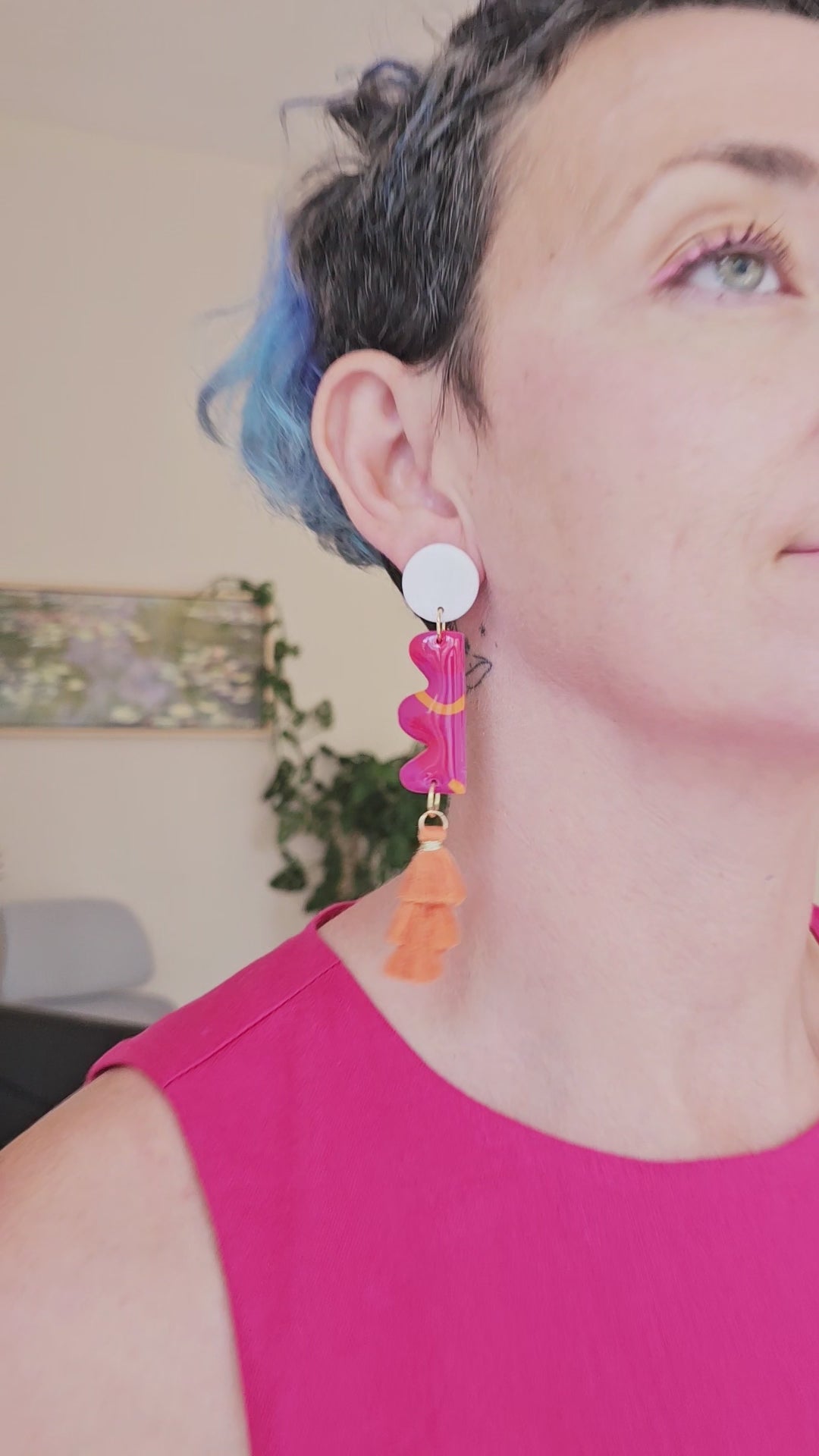 Pink Wavy Tassel Earrings - Abstract Polymer Clay Statement Dangles