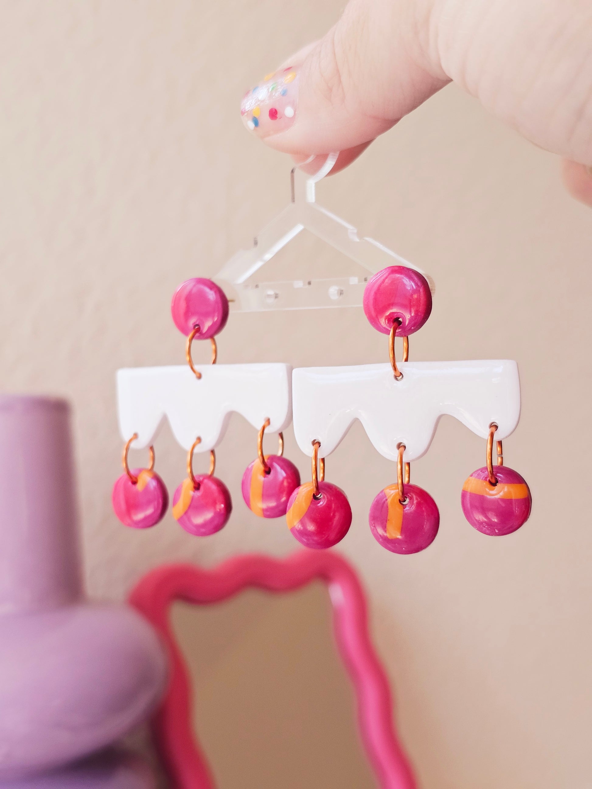 Make a bold statement with these vibrant pink and orange polymer clay earrings that perfectly capture playful sophistication. Each pair features eye-catching geometric circles in rich fuchsia and warm orange tones, suspended from elegant gold-toned hardware.