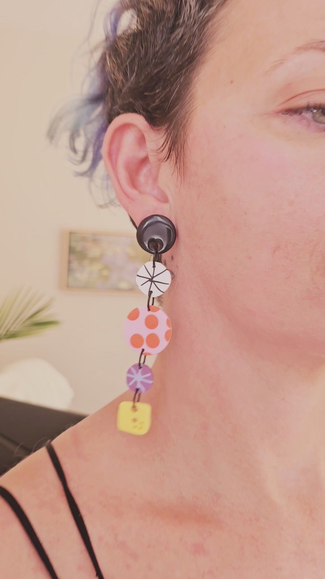 Make a bold statement with these stunning long polymer clay earrings that perfectly capture retro mod vibes! Each pair features a captivating mix of shapes, patterns, and colors that create beautiful movement and visual interest.
