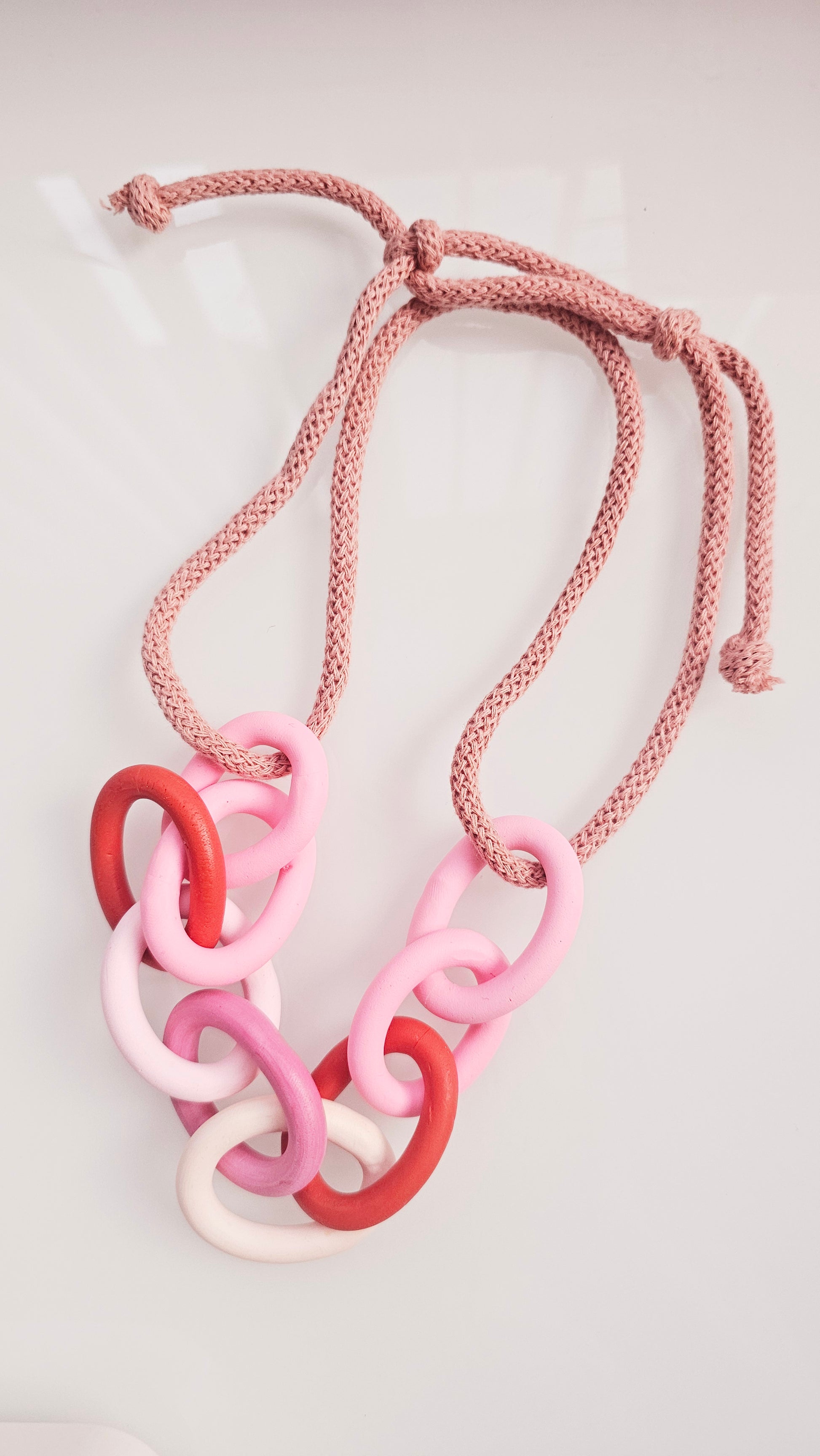 Make a bold fashion statement with this stunning chunky polymer clay chain necklace! This eye-catching piece features oversized interlocking links in a red and shades of pink color palette, perfectly balanced with a comfortable cotton cord.