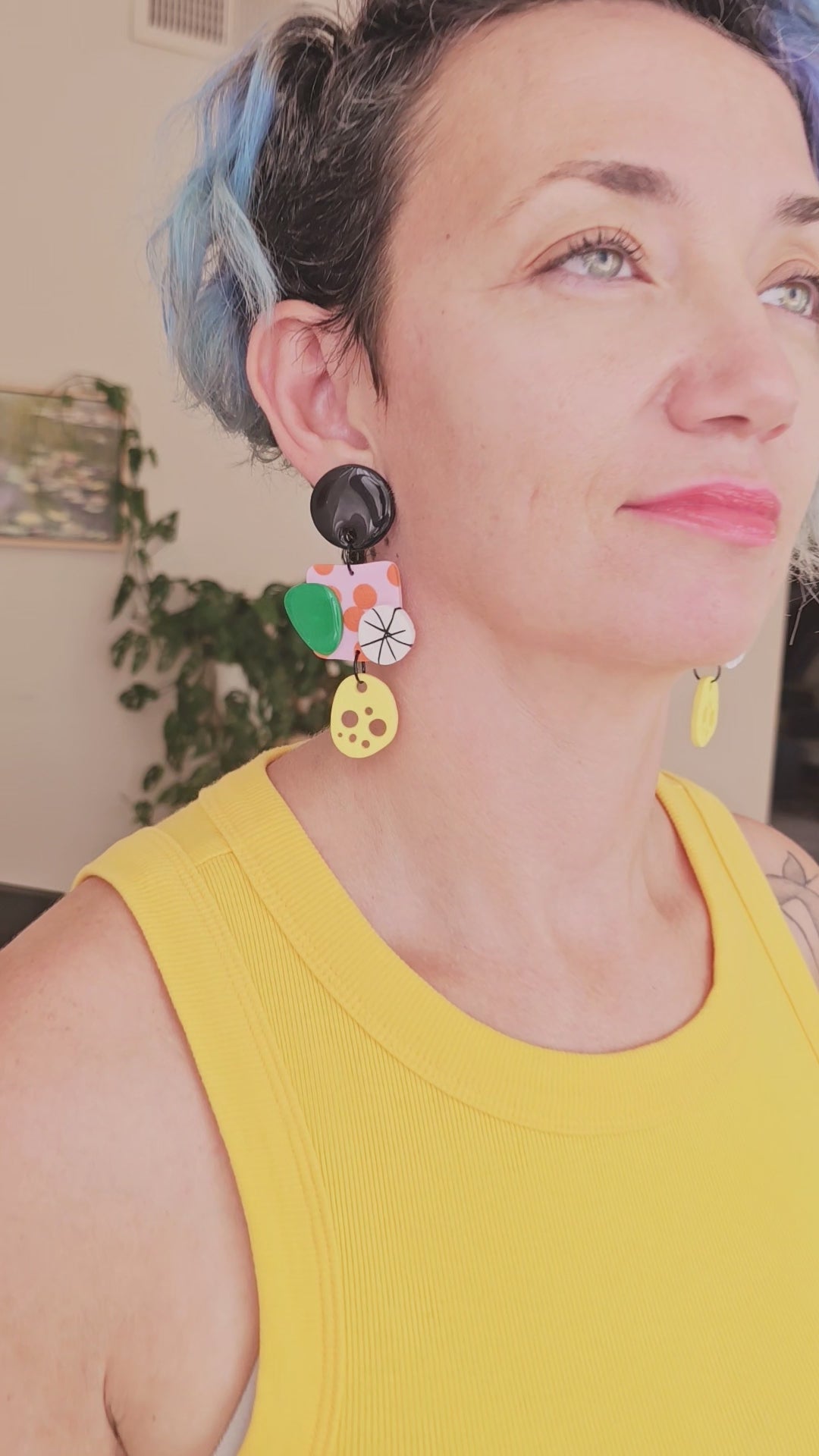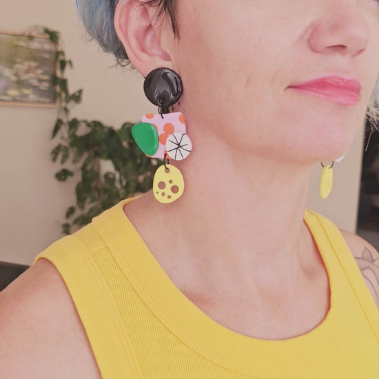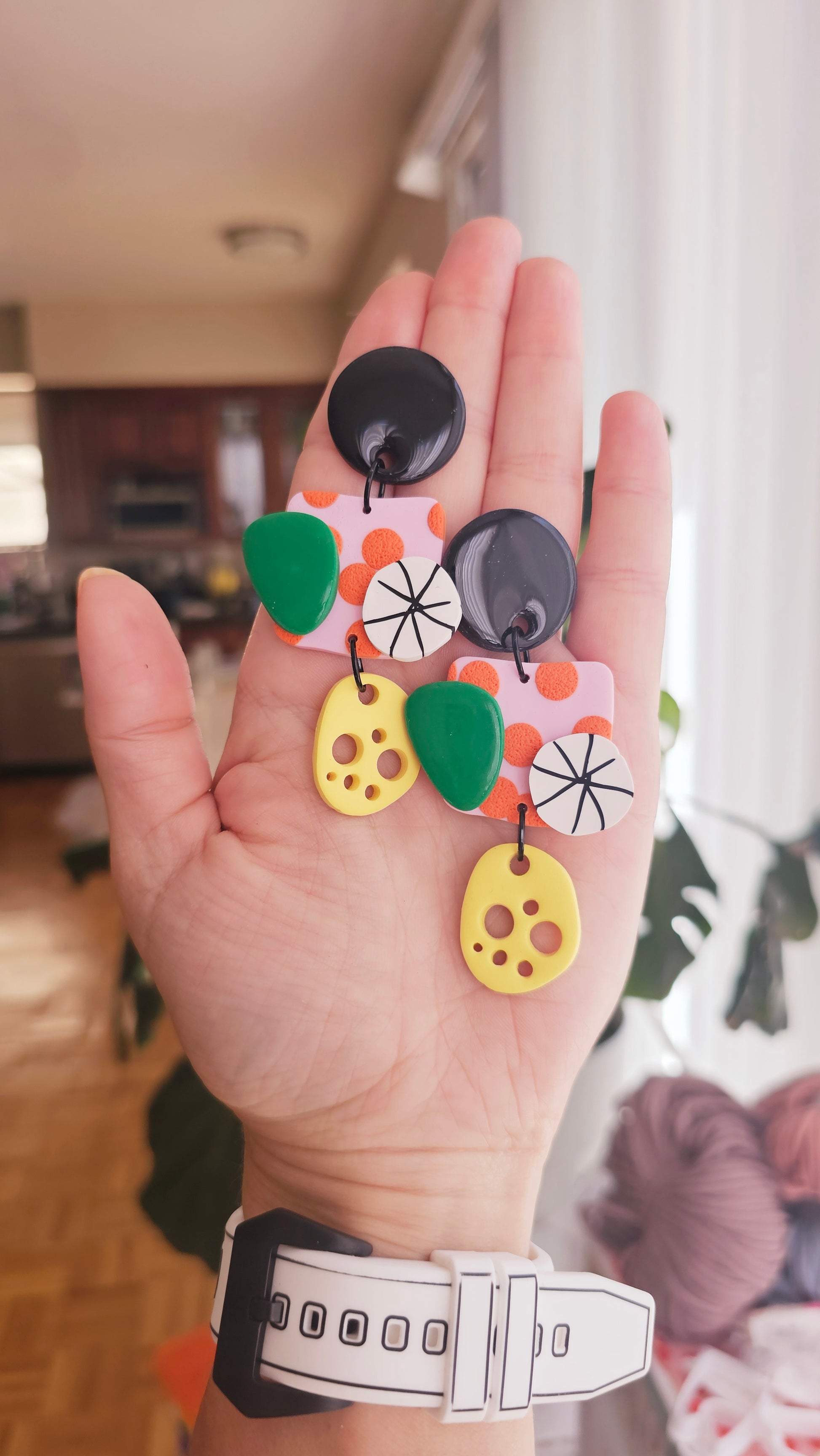 Make a bold statement with these eye-catching abstract polymer clay earrings! Each pair features a delightful mix of vibrant colors including sunny yellow, emerald green, classic black, and bright orange accents with playful geometric patterns.
